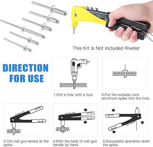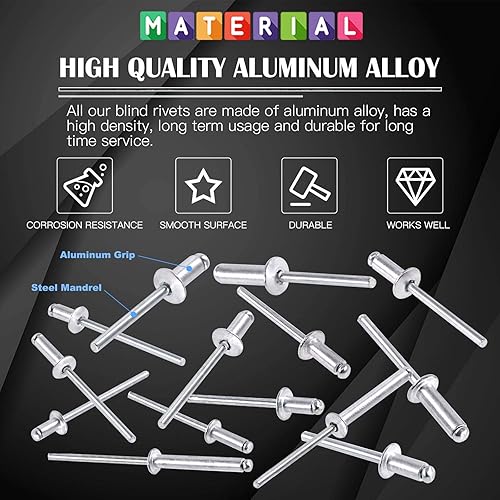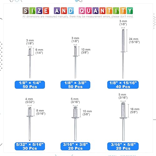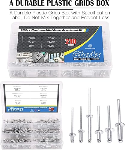 Glarks 210 Stück 6 Größen Aluminium-Körper, Stahldorn, Kuppelkopf, Blindnieten, Popnieten, Sortimentsset