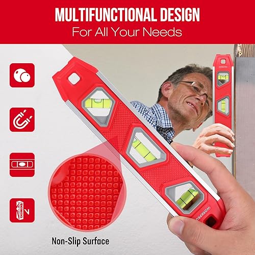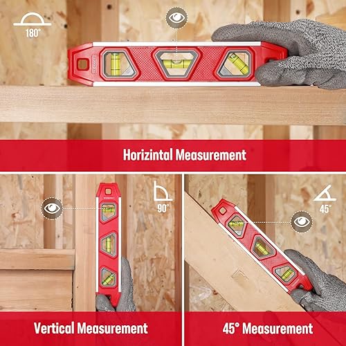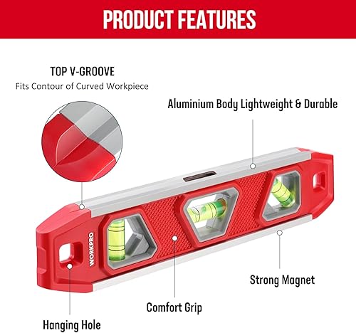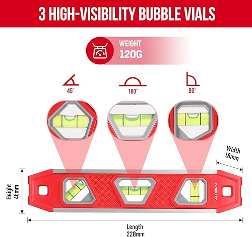 WORKPRO Wasserwaage Magnetisch 23 cm, Mini Wasserwaage Torpedo-Wasserwaage mit 3 Libellen 45°/90°/180°, Schlagfeste Blocklibelle, Aluminium-Rahmen, Starker Magnet, Oben ablesbar, Für Bauprofis