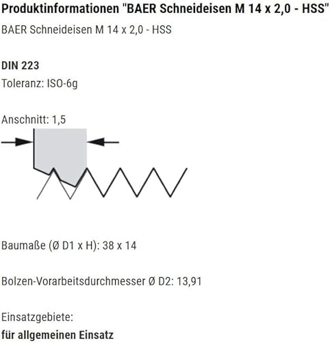 BAER Gewindeschneider M14 HSS Schneideisen - M 14 x 2,0 - Gewindeschneideisen metrisch Regelgewinde - Außengewinde Schneider aus hochlegiertem Werkzeugstahl - metrisches Außengewindeschneideisen