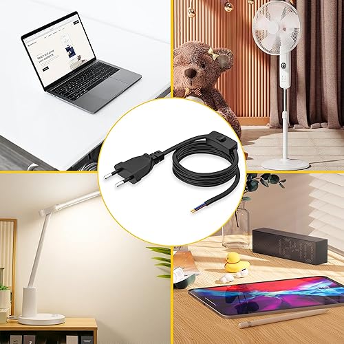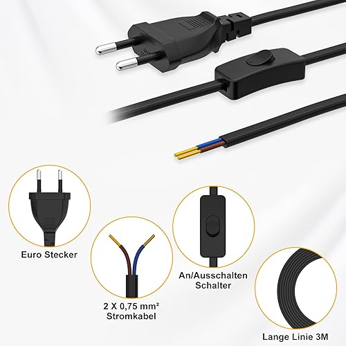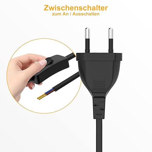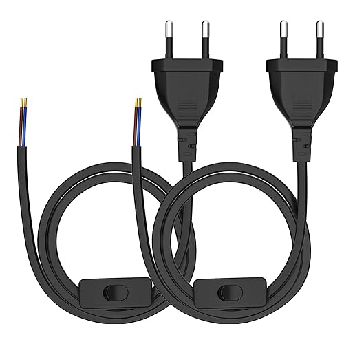 Euro Netzkabel mit Schalter [2 Stück], 3 Meter Euro Stecker Stromkabel, 2 X Ersatzkabel Anschlusskabel mit Schalter Typ C, 2 x 0,75 mm², für Leuchten, Lampen, Leuchtmittel, Schwarz