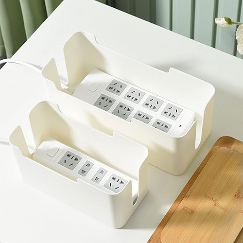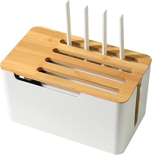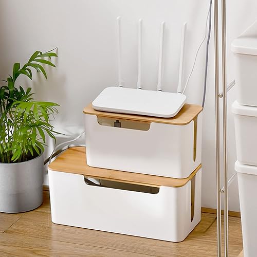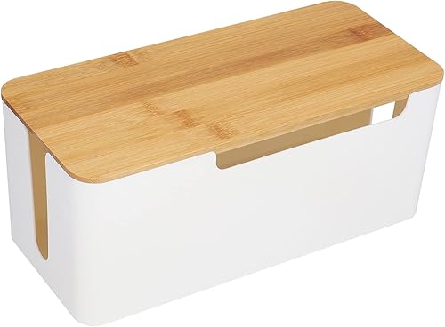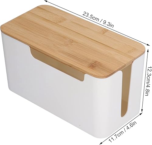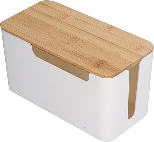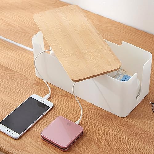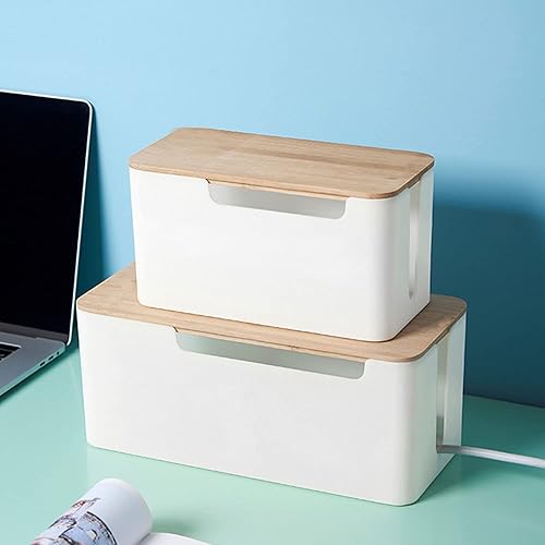 Buachois Kabelmanagement Box mit Holz Deckel und Regal, 31 x 18 x 16,5cm Weiß Kunststoff Kabelbox Große Schreibtisch Kabelkasten für Verstecken TV Computer Router Kabel Steckdosen