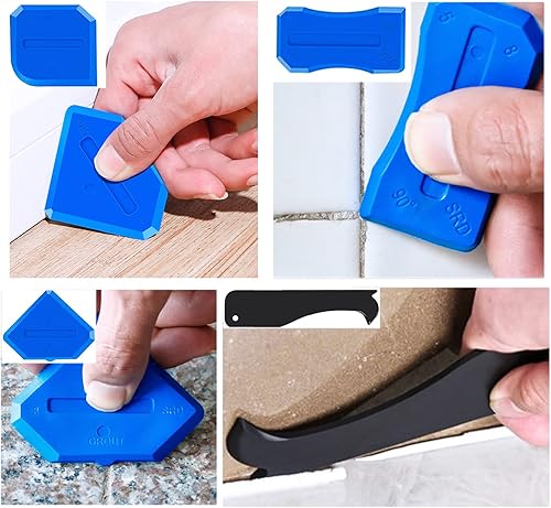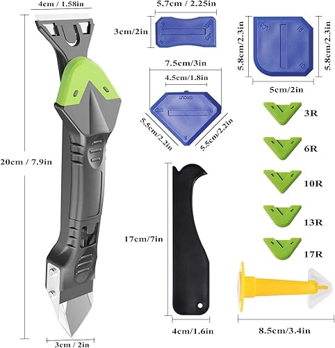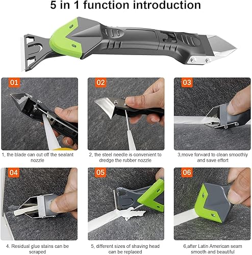 FOLAI Silikonentferner, Silikon-Dichtungsmittel-Werkzeug, Versiegelungsset 5 in 1, Entfernerkopf aus Edelstahl & 5 Silikon-Ersatz & 4 Fugenschaber-Pads für Küche, Bad, Wand, Boden, Fliesen, grau