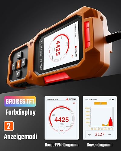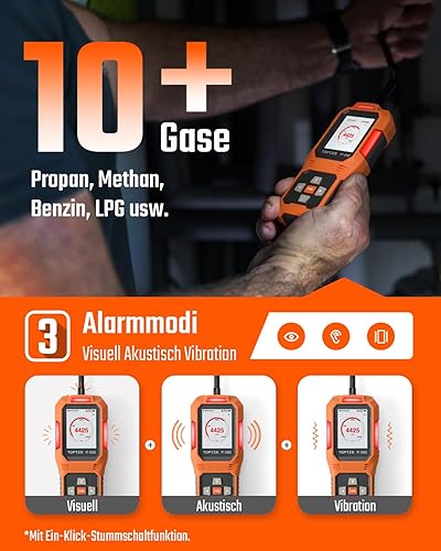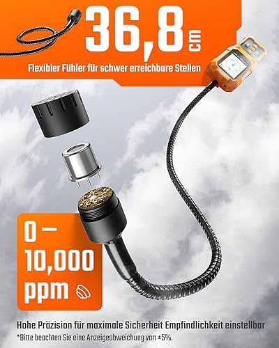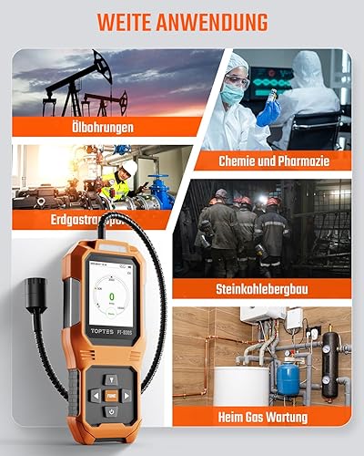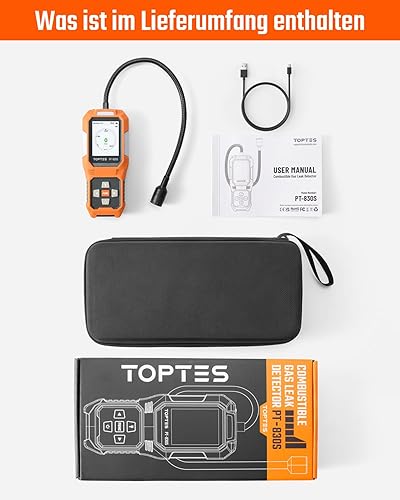 TopTes PT-830S Wiederaufladbarer Gasmelder mit 36,8cm Sonde, Bereich 0-10000 ppm, TFT-Farbdisplay mit 3 Alarmtypen, Hohe Empfindlichkeit gaslecksuchgerät für Propan, Methan für Haushalt oder Industrie