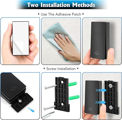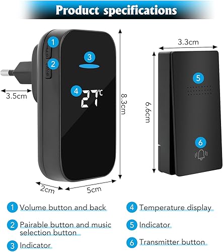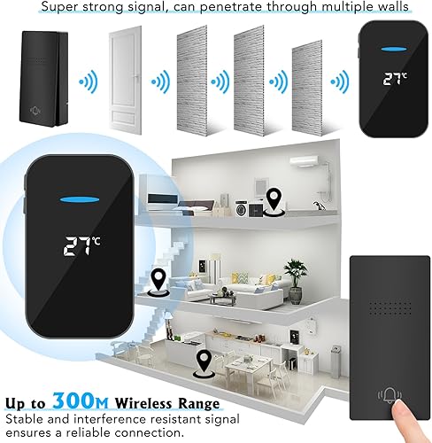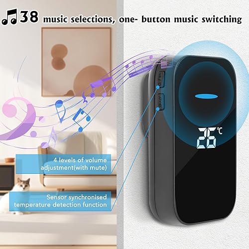 Funktürklingel, Türklingel Funk Set mit 38 Klingeltönen 4 Lautstärken Blinkende LED und Temperaturanzeige, IP67 Aussen Wasserdicht Haustür Klingel mit Drahtlose Reichweite 300m (Schwarz)