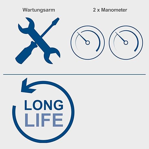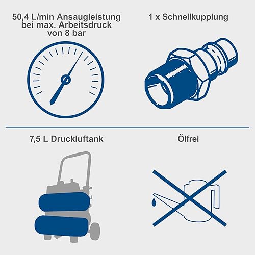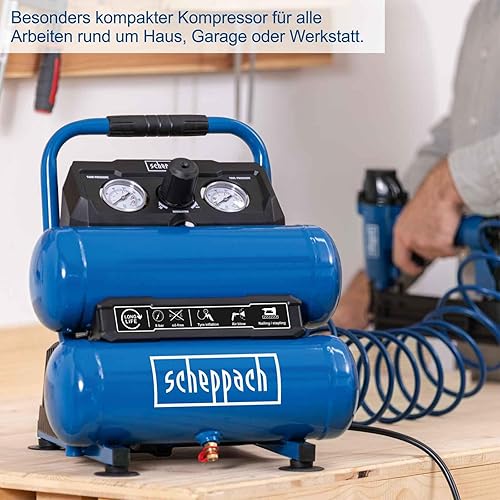Scheppach Kompressor HC10-Twin ölfreier Druckluftkompressor | 7,5L Kesselvolumen | 8 bar max. Arbeitsdruck | 50,4 L Ansaugleistung | 750W Leistung | 2 Druckmanometer, 1 Schnellkupplung & Druckminderer