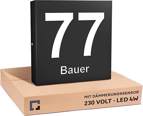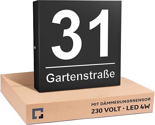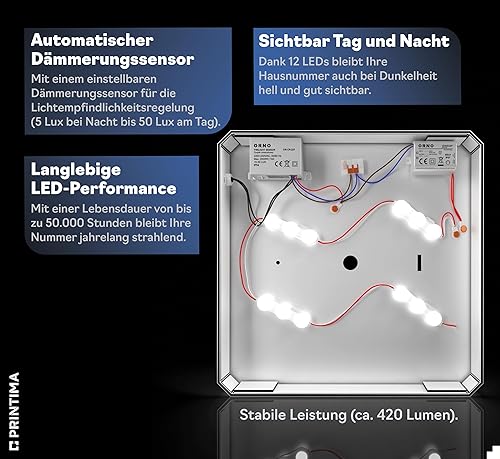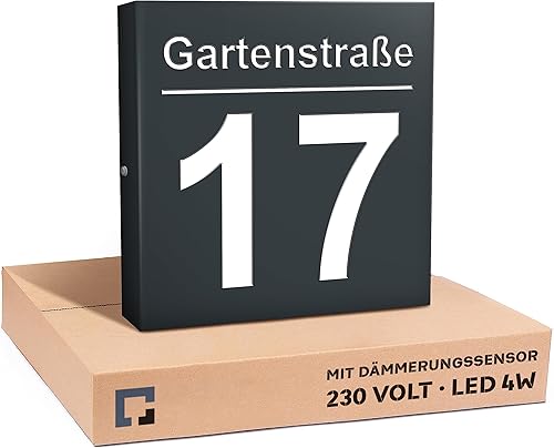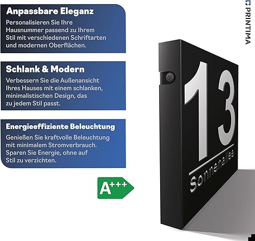 PRINTIMA Premium Gravur Personalisierter Hausnummer Anthrazit Beleuchtet Led Strom 230V, Hausnummernschild mit Dämmerungssensor |30x30cm, 4W/A+++| Wasserdicht, Funktion trifft auf Qualität und Stil