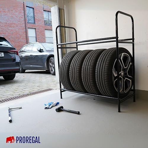 PROREGAL Reifenregal CARRERO HxBxT 106x106x46cm, bis zu 8 Reifen auf 2 Ebenen, Schwarz, Werkstattregal, Lagerregal, Kellerregal
