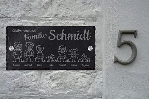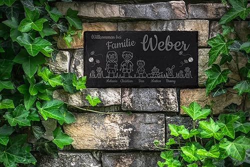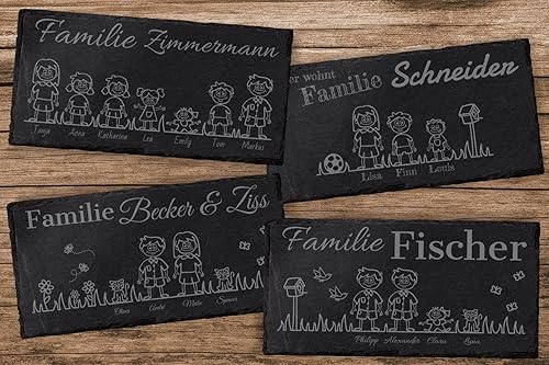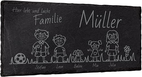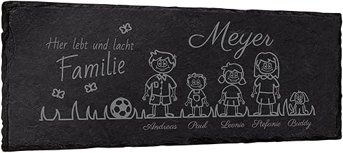 mtb more energy Graviertes Familienschild Türschild Namenschild Familie - frei wähl- und positionierbare Familienmitglieder, Haustiere, Dekoelemente - 30x15 cm - Laser Gravur auf Schiefer