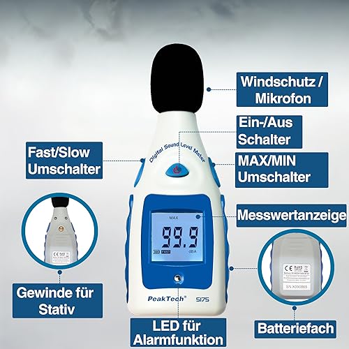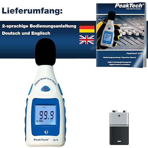 PeakTech Digital Schallpegelmessgerät 30-130 Db in A-Bewertung, 1/2 Zoll Mikrofon, Klasse 2, Lärmmessung, 1 Stück, P 5175
