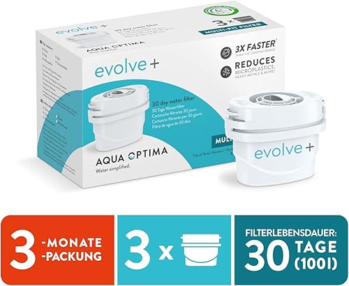 Aqua Optima Wasserfilterkartusche, Evolve+ 3er Pack (Vorrat für 3 Monate), kompatibel mit Brita Maxtra+ & PerfectFit, 5-stufiges Filtersystem reduziert Chlor, Kalk und andere Verunreinigungen