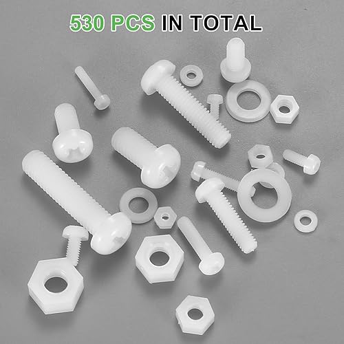 530 Stk Nylon Kunststoff Schrauben und Muttern und Unterlegscheiben Set, Flachkopfschrauben, Kreuzschlitz Rundkopfschrauben Muttern Set, metrische Sechskantschrauben - M2/M2.5/M3/M4/M5/M6