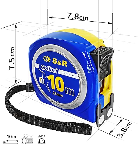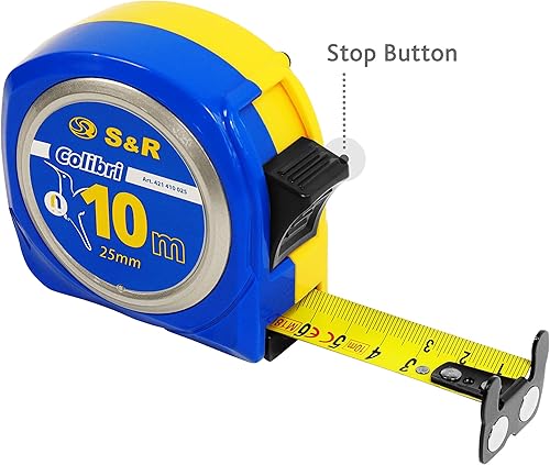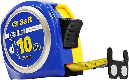 S&R Bandmaß 10 m x 25mm mit MAGNET-Haken KOMPAKTE Rollmeter Nylon-beschichtetes Massband, schlagfestes Gehäuse, Feststeller, Metermaß mit Gürtelclip Rollband