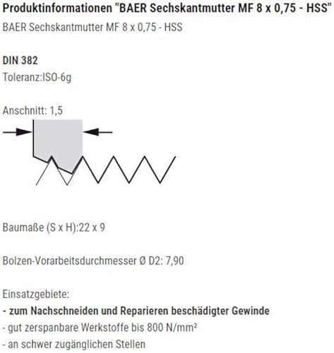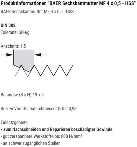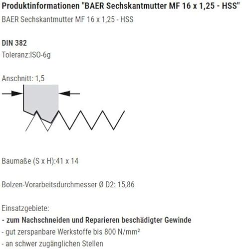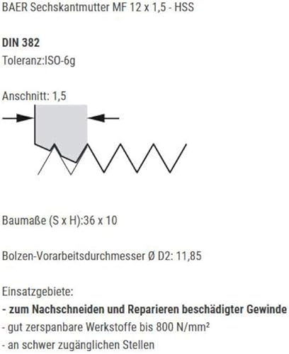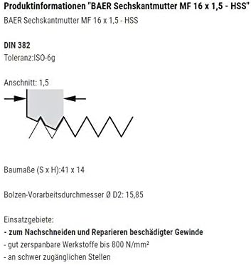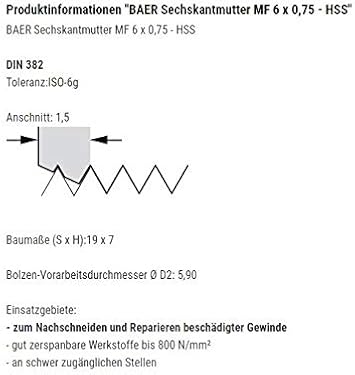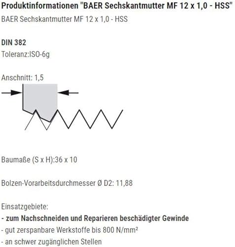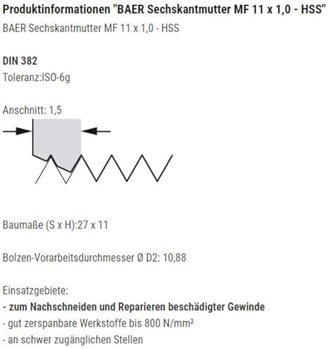 BAER Sechskantmutter MF 11 x 1,25 - HSS - Sechskant-Schneideisen Gewindeschneider Schneidmutter