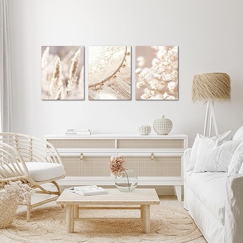 Novart Wandbilder Set Boho Style - KOMPLETT AUFHÄNGFERTIG - Wohnzimmer Schlafzimmer Deko - 3 Moderne Bilder Beige - N008735a