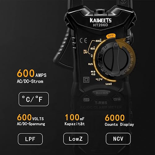 KAIWEETS HT206D Stromzange, Strommessgerät DC/AC Strom: 0-600A, Zangenmultimeter True-RMS 6000 Counts Auto-Ranging, misst Spannung Kapazität Durchgang (AC/DC-Strom)