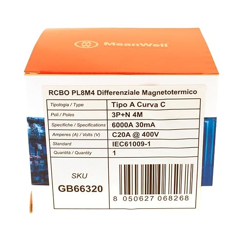 MeanWell Leitungsschutzschalter, dreiphasig, Typ A 30 mA, RCBO 3P+N C20 20 A, Kurve C 6000 A 380 V, 4 Pole mit 4 Modulen DIN-Schiene