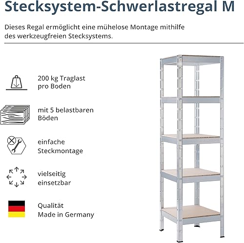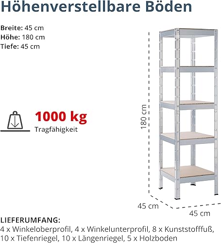 SCHULTE Regalwelt Schwerlastregal mit 5 Holzböden, 180x45x45 cm (HxBxT), Traglast pro Ebene ca. 200 Kg, verzinkt, Lagerregal, Kellerregal, Werkstattregal, Steckregal