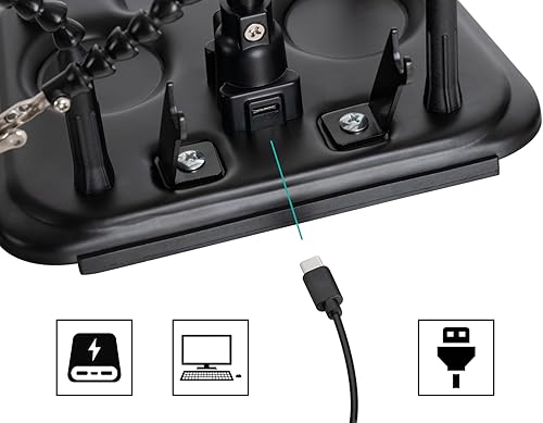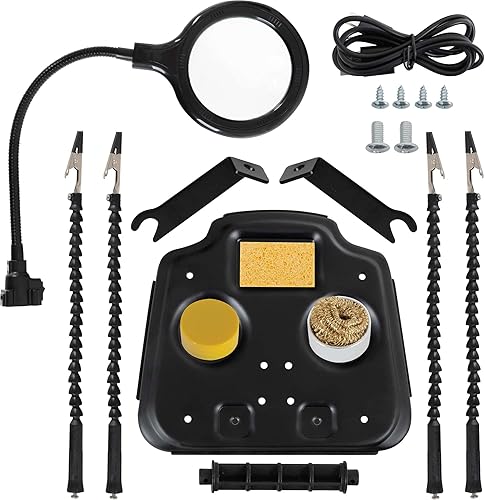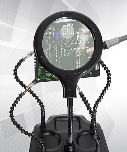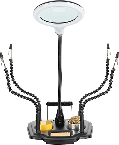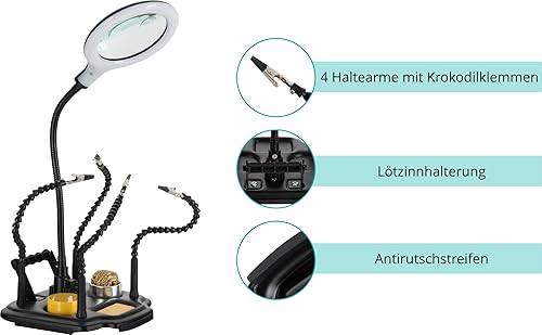 Stagecaptain LH-440 Löthilfe mit Lupenleuchte - Helfende Hand für Bastel- und Lötarbeiten - Flexible Arme mit Krokodilklemme - Biegsame Lupe (3/12 Dioptrien) mit LED-Beleuchtung - Lötspitzenreiniger