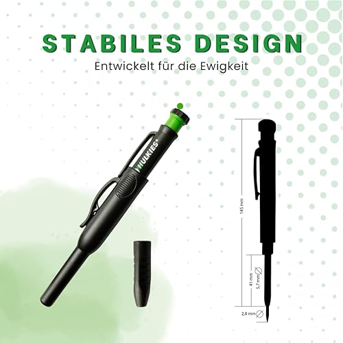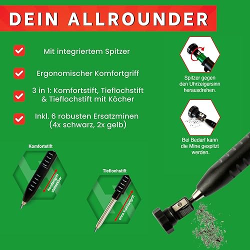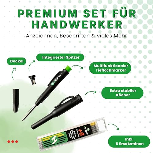 Hulkies 3-in-1 Tieflochmarker – 10-teiliges Profi-Set: Zimmermannsbleistift, Tieflochstift & Köcher – Markierstift für Handwerker inkl. 6 Ersatzminen & integriertem Spitzer