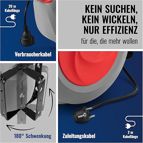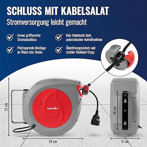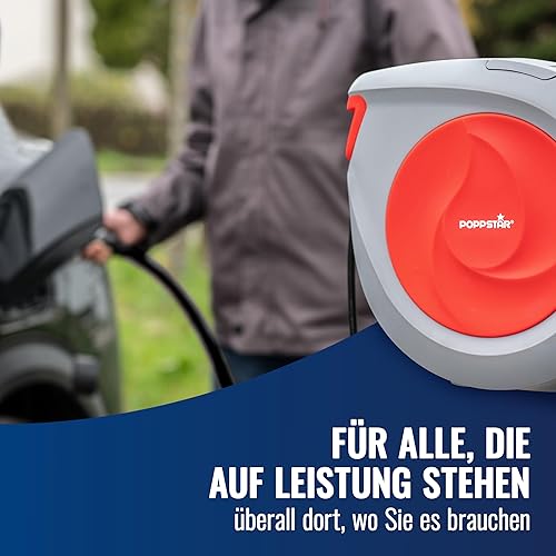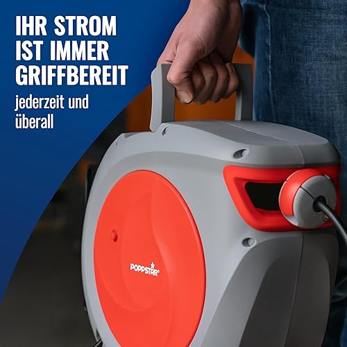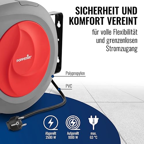 Poppstar Automatischer Kabelaufroller 20m + 2m (max. 2500W) Automatik-Kabeltrommel selbstaufrollend IP20 für Wand- und Deckenmontage