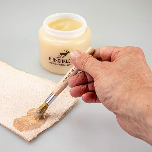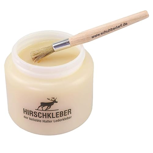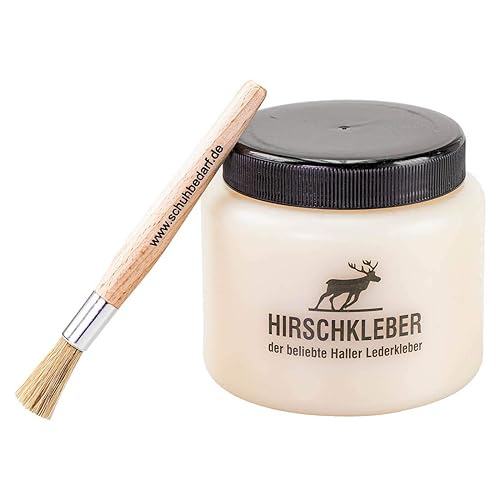 Hirschkleber 600gr + Auftragspinsel - sehr ergiebiger Klebstoff für Leder, Pappe, Filz, Papier, Textilien - Vorzügliche Klebkraft - Kein Geruch, trocknet rasch, schlägt nicht durch, lange haltbar.