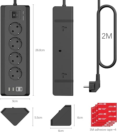 Ecksteckdose mit 2 USB und 2 Type-C, 4 Fach Mehrfachsteckdose mit Schalter, Steckdosenleiste Überspannungsschutz mit 2M Kabel für Küche (Schwarz)