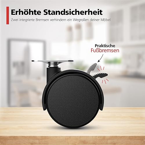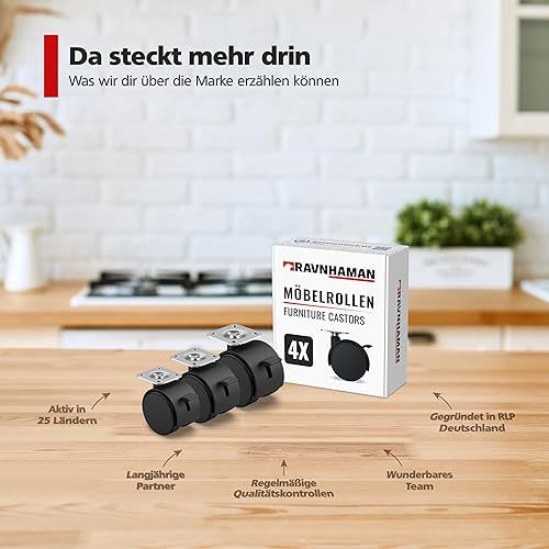 RAVN HAMAN 4er Set Möbelrollen 50 mm - Lenkrollen mit Bremse bis 30 kg pro Rad - Schwenkrollen für Innenmöbel - Transportrollen mit geringem Rollwiderstand