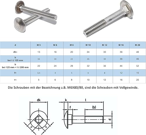 Schlossschrauben M6x100/100 6 Stück Flachrundschrauben mit Vierkantansatz DIN 603 A2 Edelstahl