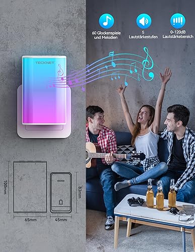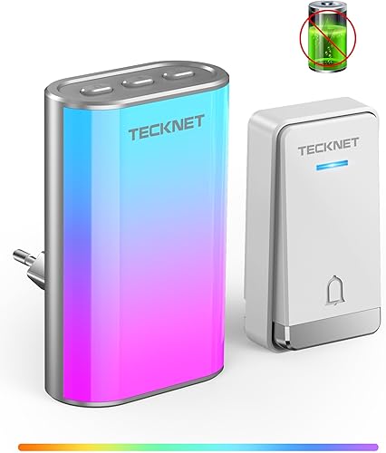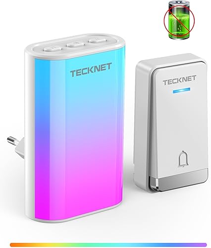 TECKNET Funkklingel, RGB Licht Türklingel Batterielose, Funkklingel Aussen Wasserdich Kabellose Türklingel Kit mit 60 Melodien, IP65, 400m