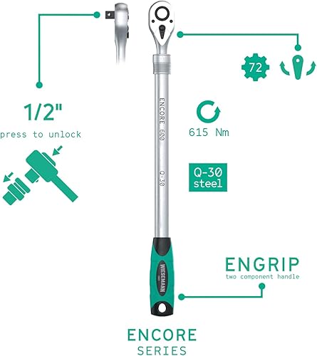WIESEMANN 1893 Teleskop-Ratsche 1/2 Zoll ENCORE 600 45-60cm I Teleskop-Knarre für Arbeiten mit hohen Drehmomenten bis 615 Nm I Mit 72 Zähnen, Ball Guard & Umschaltfunktion I 81338