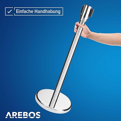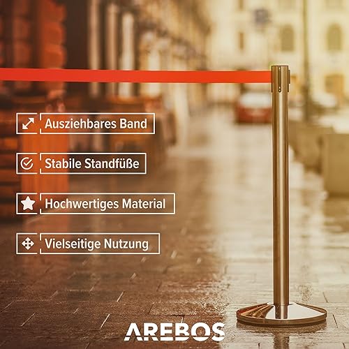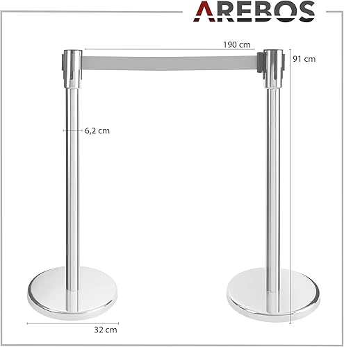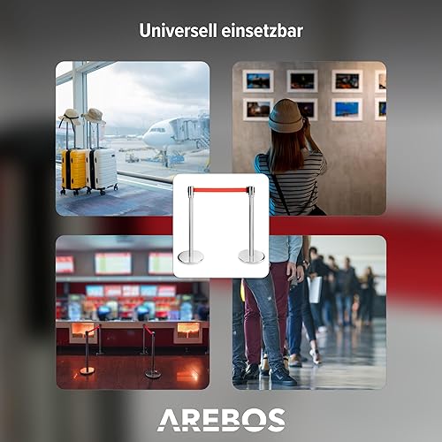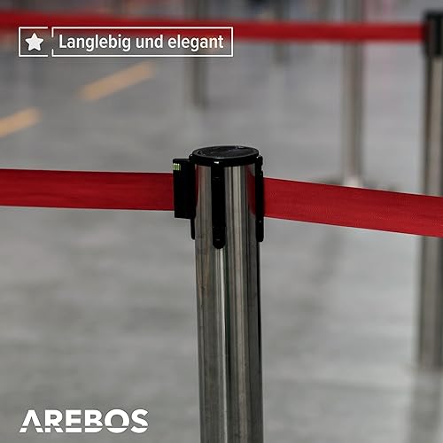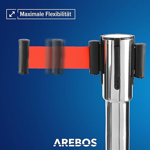 Arebos Personenleitsystem | 2 Stück | Absperrständer | Absperrband | Absperrpfosten | Abgrenzungspfosten | Bandfarbe: Rot | Bandlänge: 190 cm | im Innen- und Außenbereich einsetzbar