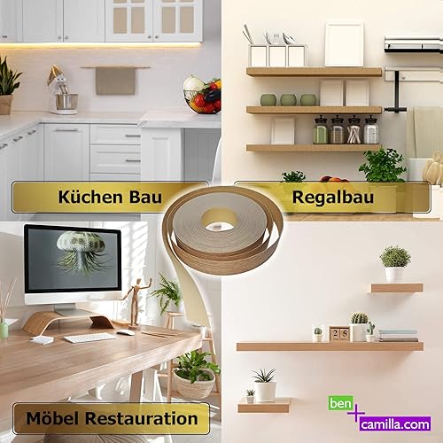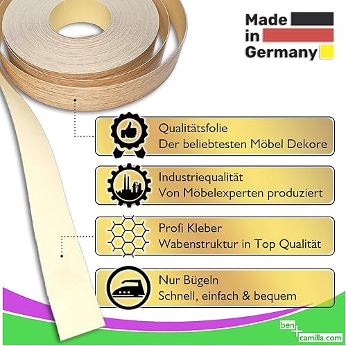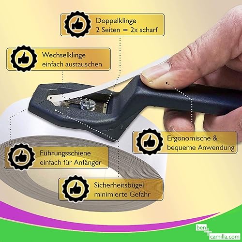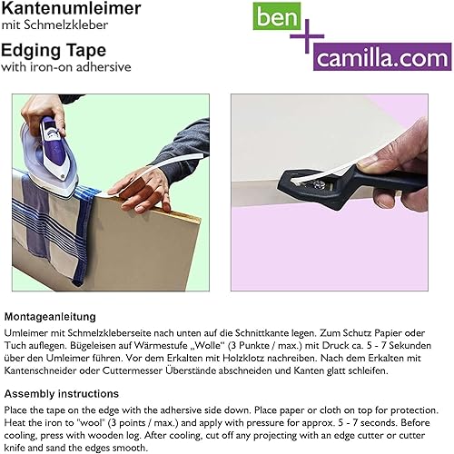 ben+camilla.com STARTER-SET Kantenschneider + Kantenumleimer Weiß 20 mm x 10 Meter Rolle Kantenband mit Schmelzkleber weiss glatt matt zum Aufbügeln inkl. extra sicherem Kantentrimmer