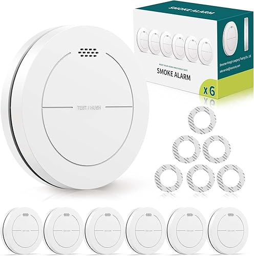 Rauchmelder 6er Set, ohne Blinkende LED, mit 10 Jahre Batterie, mit Klebepads, Mute Funktion, 85 dB Alarmton, Standalone Flacher Brandmelder für den Brandschutz zu Hause.