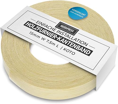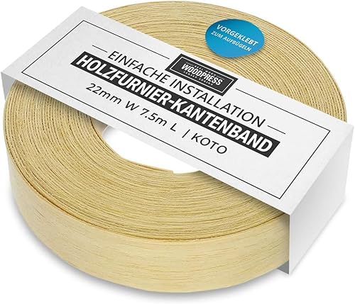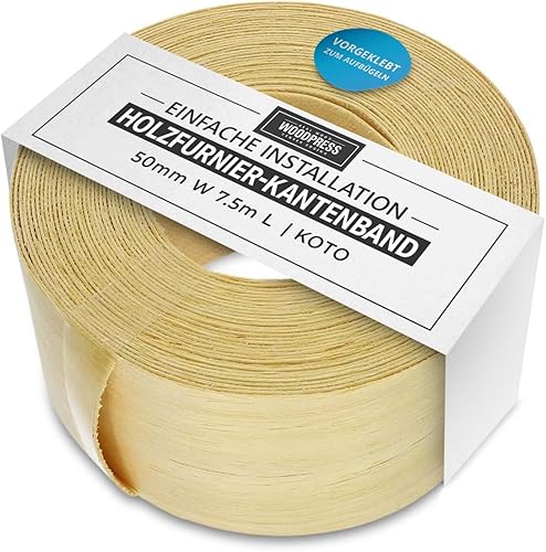 WoodPress 50 mm echtes Koto Kantenband – 7,5 m Kantenstreifen zum Aufbügeln – vorgeklebtes Holzfurnierband für Heimwerkeranwendungen – Kantenband für Möbelrestaurierung – Schmelzklebstoff für
