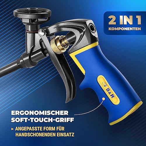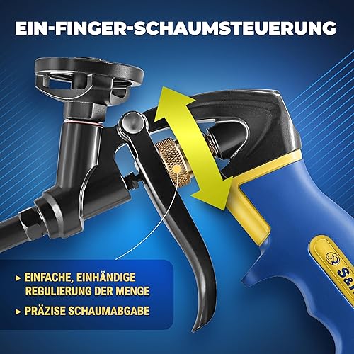 S&R Schaumpistole, komplette PTFE Antihaft-Beschichtung, Präzise Dosier-Pistole mit Einhand-Einstellung für PU-Schaum, Füllschaum-Dosen, Bauschaum und Dämm-Schaumkartuschen in Handwerk, Industrie