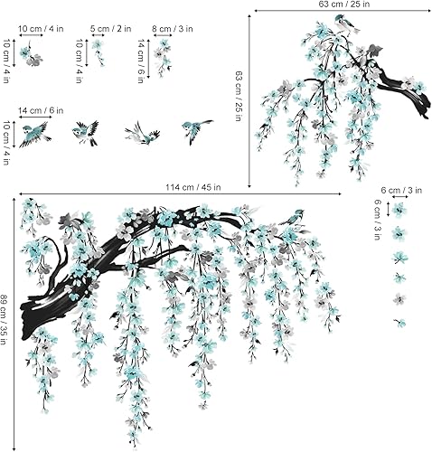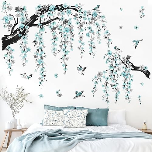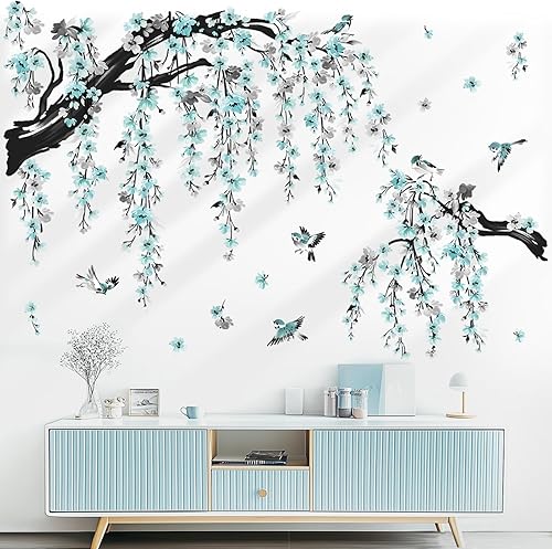 wondever Wandtattoo Baum Ast Blüten Groß Wandaufkleber Hängende Blumen Blau Wandsticker Wanddeko für Wohnzimmer Schlafzimmer Sofa Hintergrund