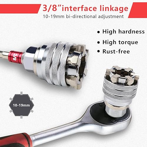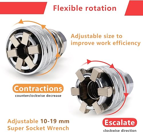 Raxfekro 2 Stück Multifunktions-Universal-Steckschlüsselwerkzeug mit 2 Stück 3/8'-Zoll-Schnittstellen-Pleuelstangen, Verstellbare 10-19mm Super Steckschlüssel