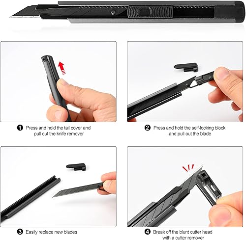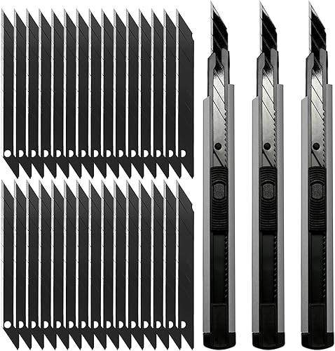 FOSHIO 3 Stück Professional 9mm Messer Cuttermesser mit 30 pcs 30°Abbrechklingen, Cuttermesser Profi, Cutter klingen für Folien, Papier, Basteln und Tapete Schwarz
