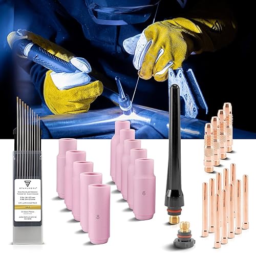 STAHLWERK WP-26 WIG Schweißzubehör Schweißgerät Verschleißteile: Spannhülsen + Gehäuse + Keramikdüsen + Wolframelektroden für WP SR Binzel 17 18 26 WIG-Schweißbrenner, Set 36-tlg.