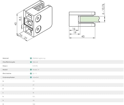 Sellon24® Glashalter 4 Stück Zamak Glasklemme Zink RAL 9005 Geländer Schwarz 45x45 mm Eckig Anschluss flach (Schwarz 8,76 mm)