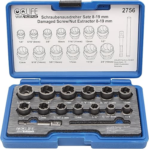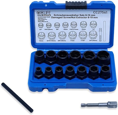 CCLIFE 15tlg 3/8' Cr-Mo Spezial Steckschlüssel Einsatz Linksausdreher Schraubenausdreher Nuss Stecknuss Muttern Entferner | 8-19mm | Turbonüsse