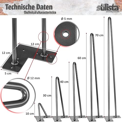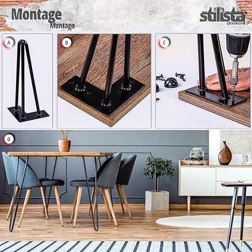 STILISTA® 4er Set Hairpin Legs Möbelfüße mit Zwei Stangen 10 bis 70 cm, schwarz oder Silber