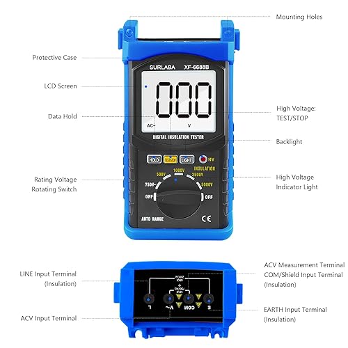 SURLABA Isolationsmesser Isolationswiderstandstester, Digital Megohmmeter XF-6688B Hochspannung 500/1000/2500/5000V, 1MΩ~200GΩ Widerstandsprüfung, 750V AC Isolationsmessgerät für Elektrische Geräte