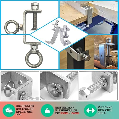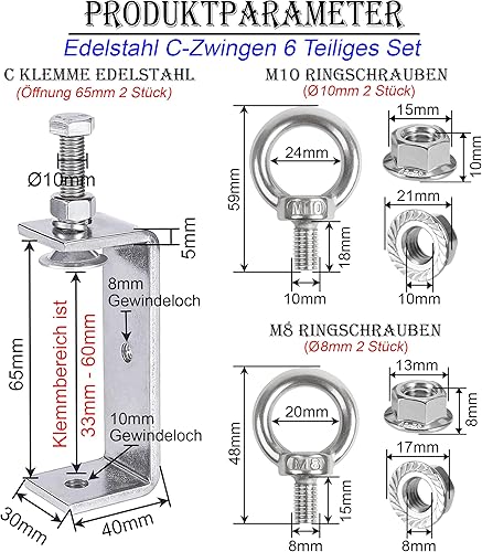 LEAUM 6 Teiliges Set 304 Edelstahl C-Zwingen, Hochleistungs C Klemme Einstellbar Klemmbereich ist 33-60mm, Klemme Kieferöffnungen 65mm mit M10 Ringschrauben und M8 Ringschrauben für Holzbearbeitung