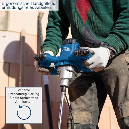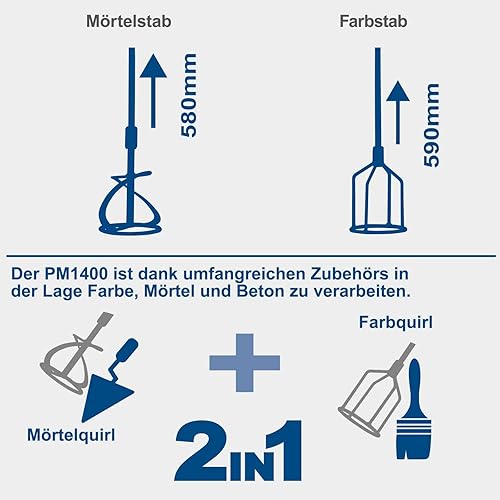 Scheppach Handrührwerk PM1400 Rührwerk Mörtelrührer Farbrührer | 1400W Leistung | 2-Gang-Getriebe mit variabler Drehzahl 570 / 760min1 | inkl. Mörtel (580mm) und Farbquirl (590mm) mit M14 Gewinde