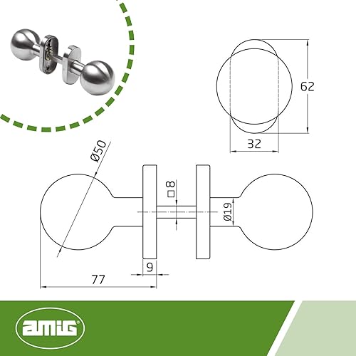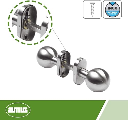 Amig - Drehknauf-Set für Türen, Mod. 11ALGR | Ø 62 x 77 mm | mit Rosettenblende, ergonomischer Griff, inkl. Diebstahlschutzschrauben | ohne Feder | Edelstahl 18/8 matt