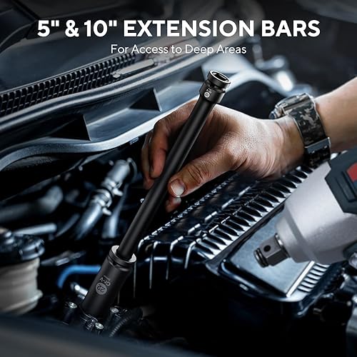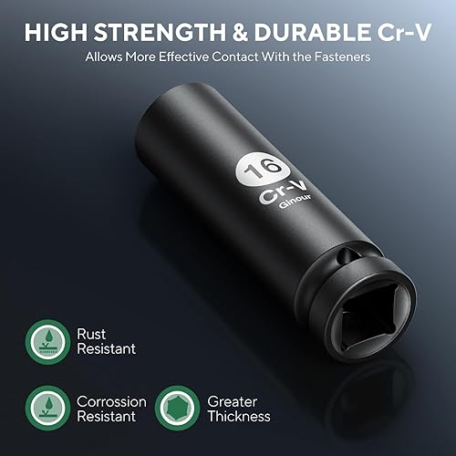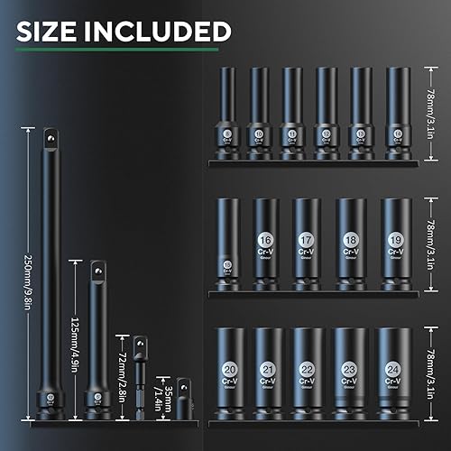 Ginour 20 tlg 1/2' Schlagschrauber Nüsse Set 8-24mm CR-V 16 tlg Sechskant Kraft Nuss, Stecknuss Set mit 3, 5,10-inch Verlängerung und 3/8' auf 1/2' Adapter