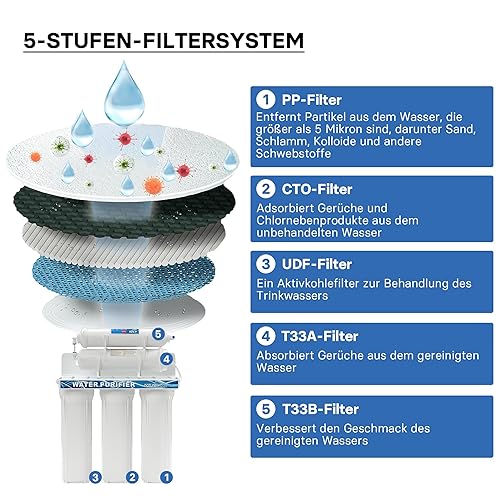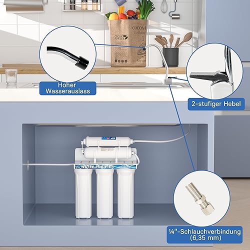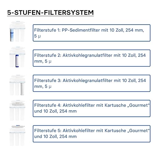 Naturewater NW-PR305 5 Stufen Wasserfilter, 5 µ, PP Kartusche, Untertischfilter Wandhalterung, Filterschlüssel, Sedimentfilter Aktivkohle, Wasserhahn, 2,5m Schlauch, Kurzdreiwegeventil, Kugelhahn