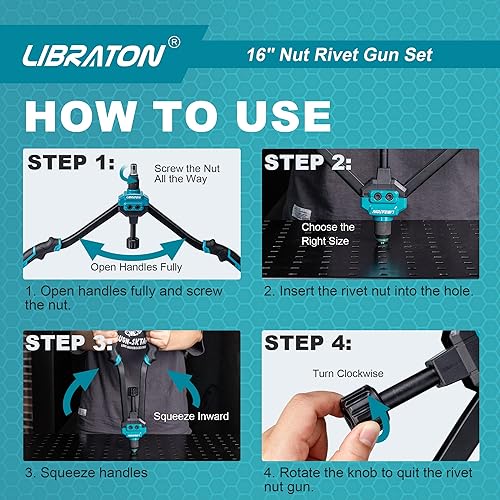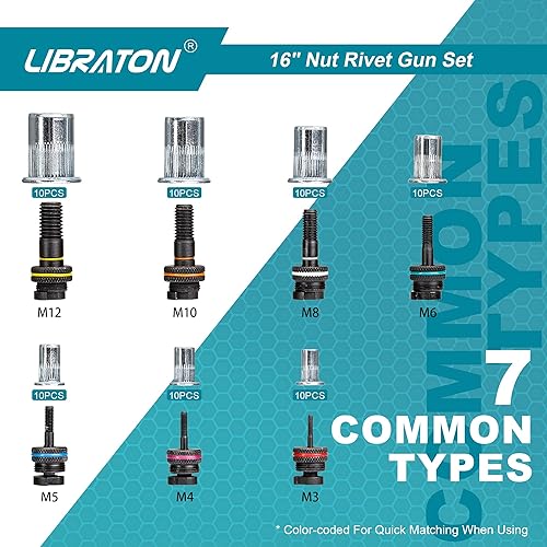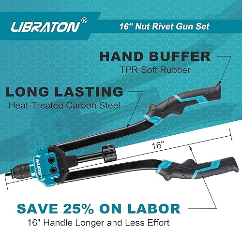 Libraton Nietmutternzange, 16' Nietzange Set, Doppelgriff Nietmutter Zange Werkzeug inkl. 70 Nietmuttern, 7 Austauschbare Nietdorne und Tragetasche
