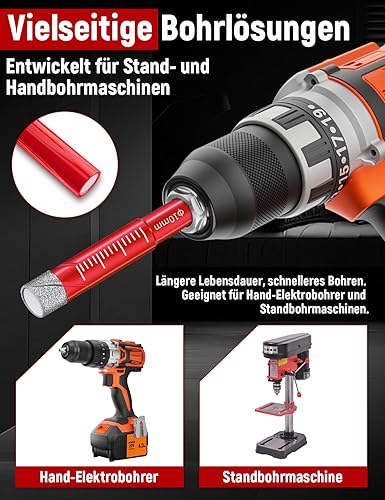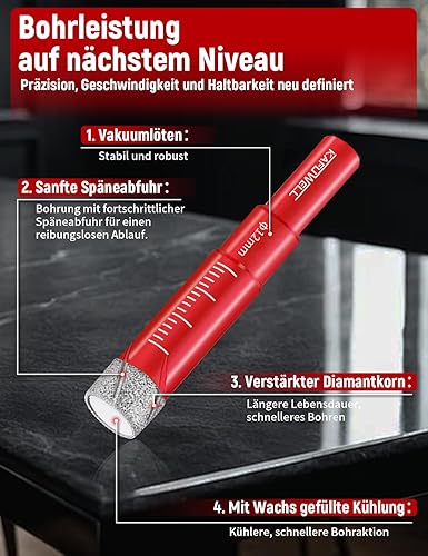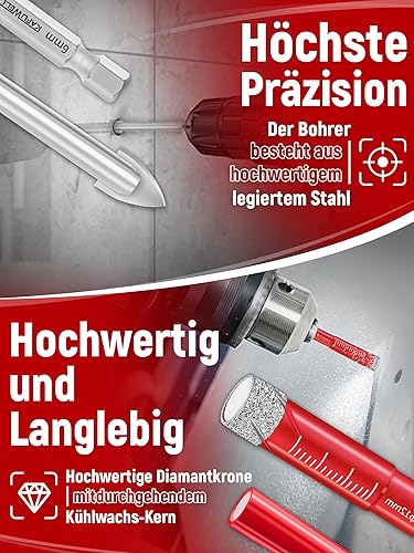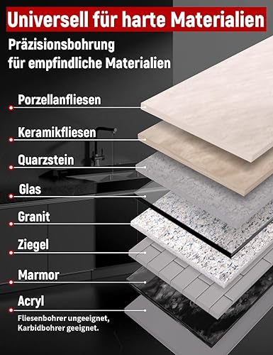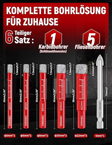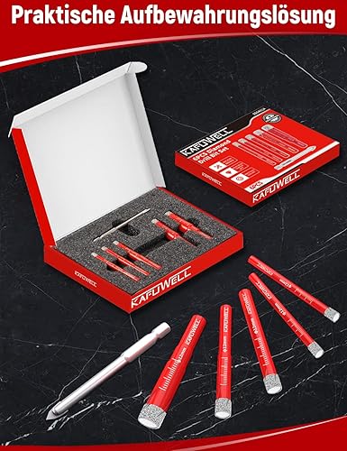 KAFUWELL Fliesenbohrer Diamantbohrer Professional Set 6tlg, 5-12mm Glasbohrer & 6mm Karbid-Anbohrer für Keramik, Granit, Glas, Porzellan, Fliesen, harte Fliesen, Feinsteinzeug, Stein